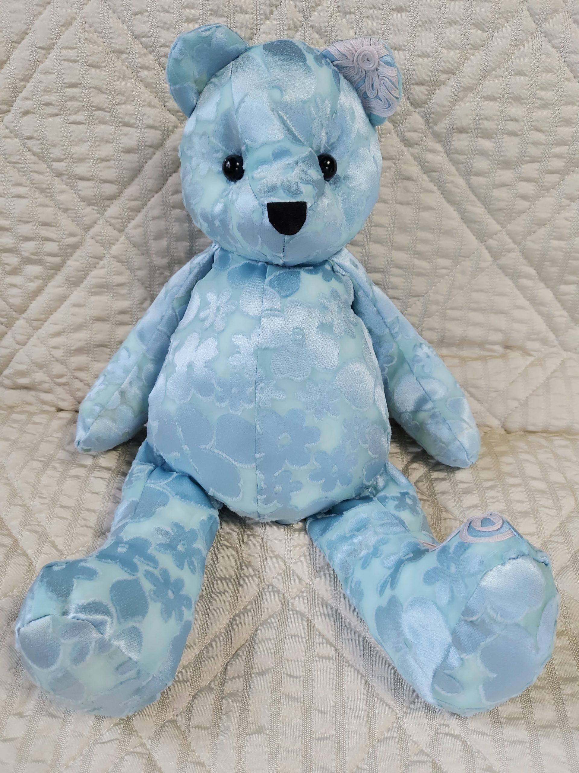 生地の伸縮性などによって多少出来上がりに差が出ますが、ベアは座った状態で高さ約30センチ、寝かせたときの長さが約40センチ程度です。